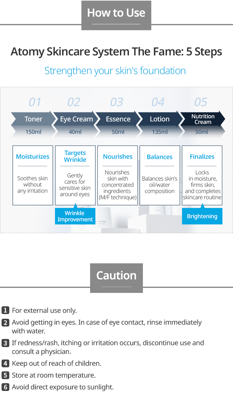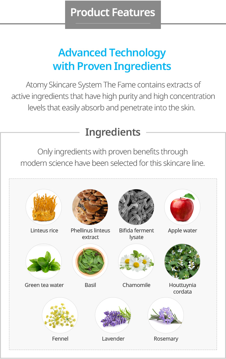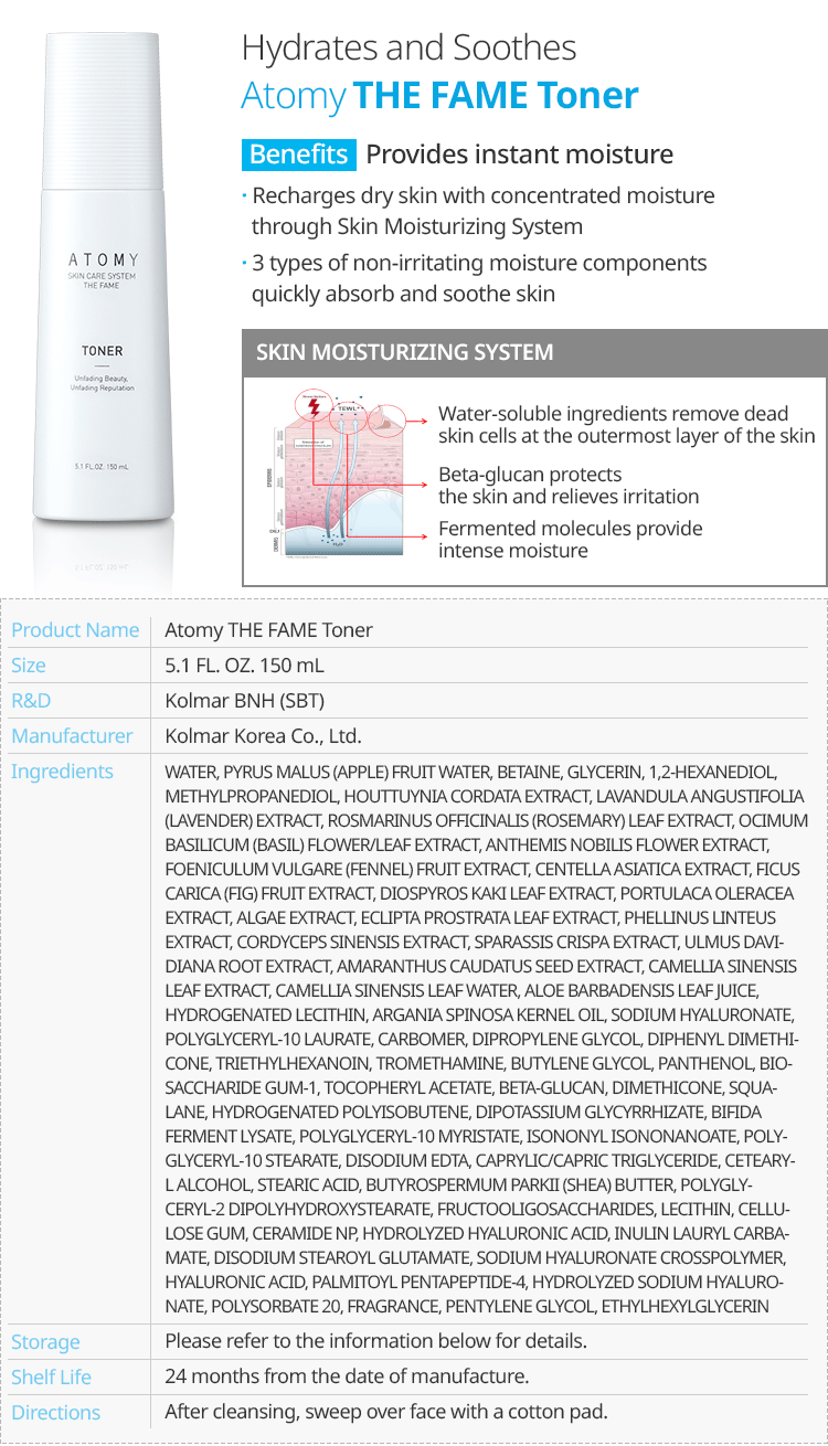 Atomy The Fame Toner is a premium skincare product designed to hydrate and balance your skin. Formulated with high-quality ingredients, it provides intense moisture and a refreshing effect, leaving your skin feeling soft, smooth, and revitalized. Perfect for daily use to maintain a healthy, radiant complexion.